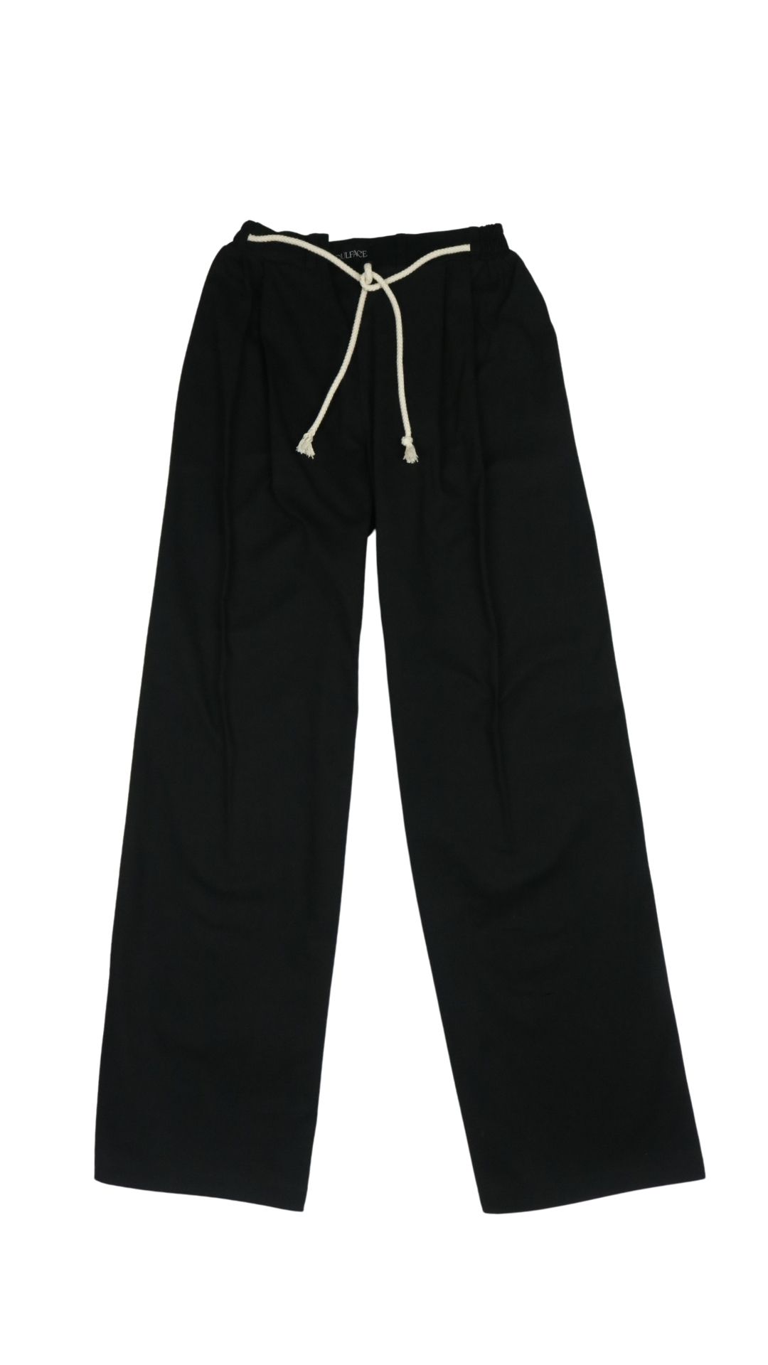 Pantalón de bota recta y ancha. Prenses delanteros y pretina enrresortada en posterior. Pasadores y cordón de algodón grueso decorativo.